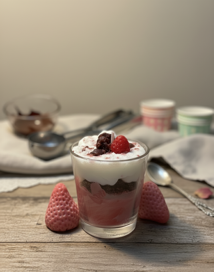 Indulge your senses without the calories! Our 'Blush Hour' candle is a stunning visual and aromatic treat, meticulously crafted to look like a decadent mini dessert parfait.